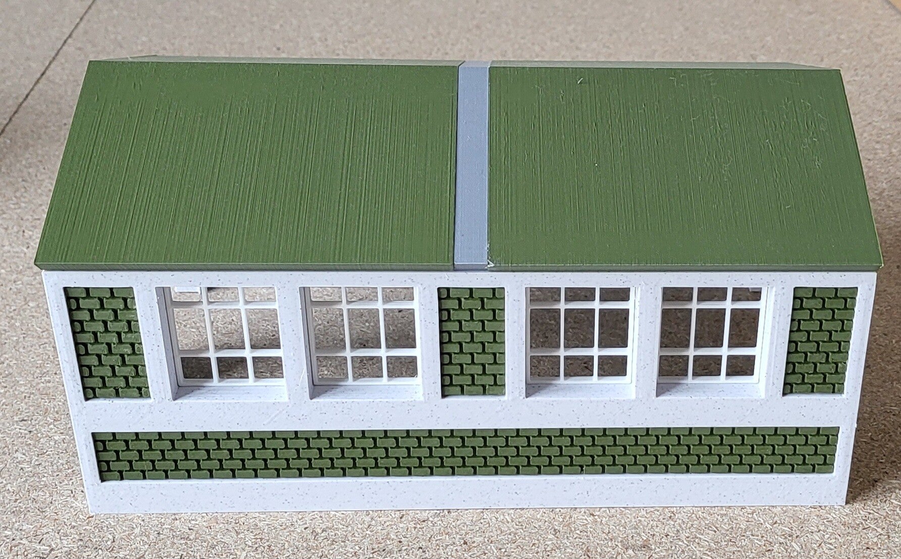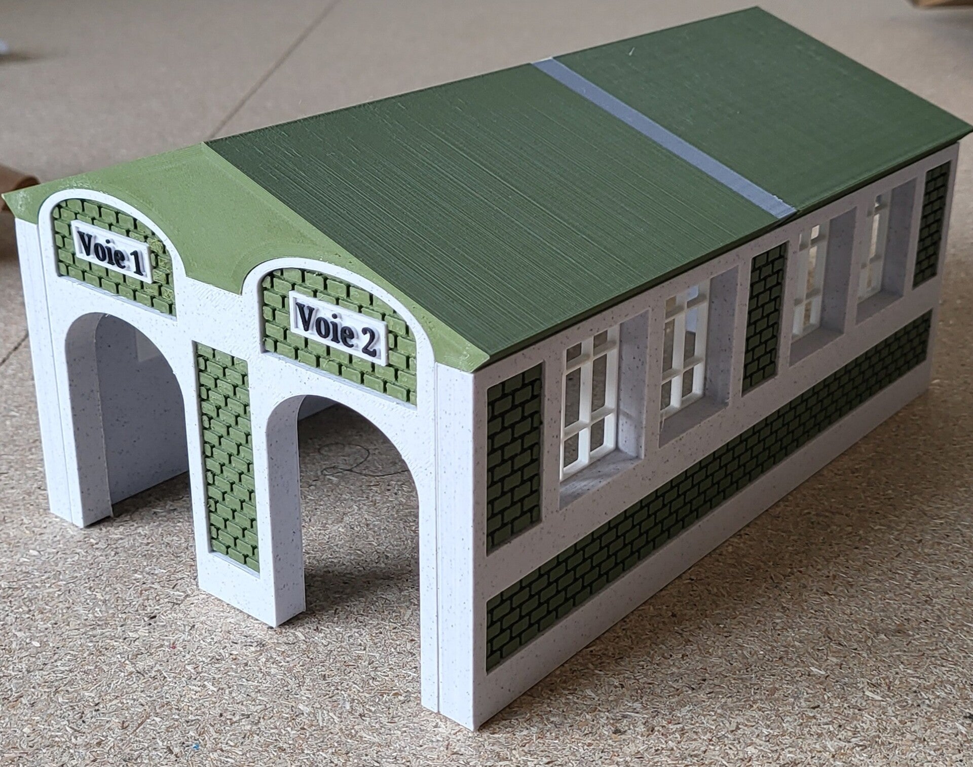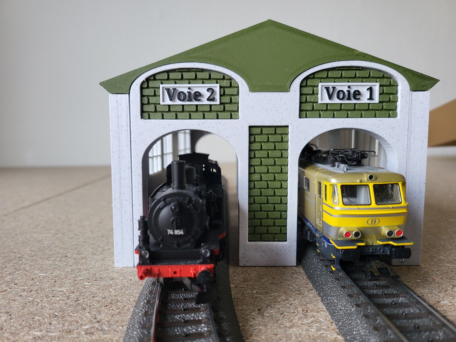 - Hangar type atelier loco HO de 250mm de long par 160 mm de large. (porte trop basse pour pantographe relevé)