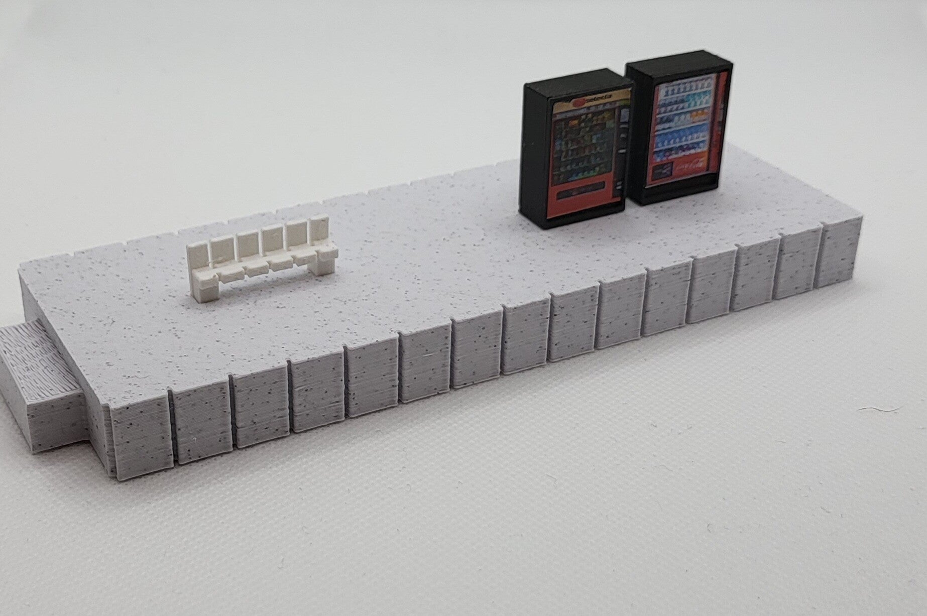 - Ensemble de 3 modules composé de 1 quai principal + 2 quais d'accessoires + 2 rampes de fin + au choix bancs et distributeurs (2 bancs ou 1 banc et 2 distributeurs par quai d'accessoires).